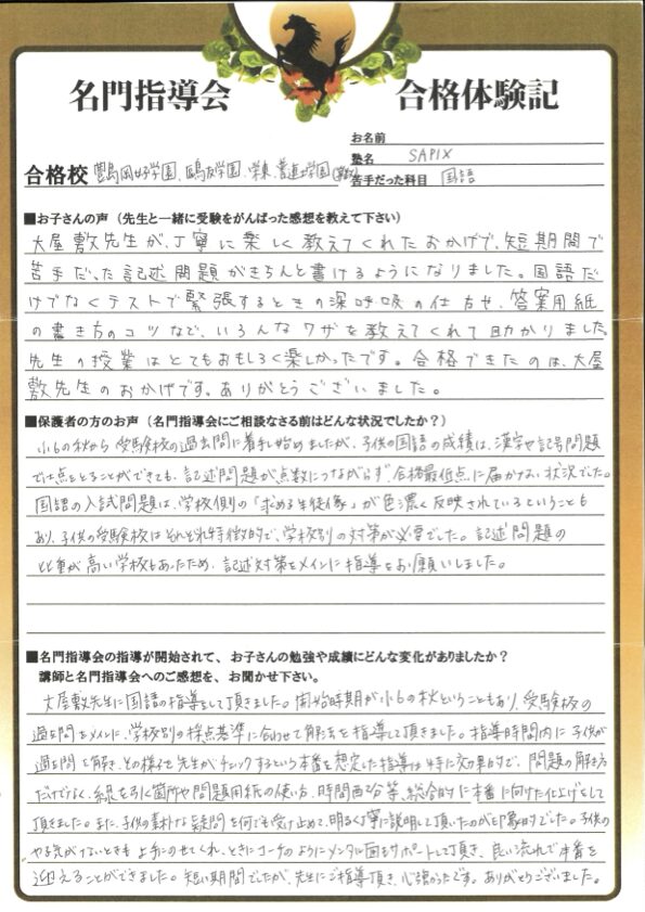 大屋敷先生が丁寧に楽しく教えてくれたおかげで、短期間で苦手だった記述問題がきちんと書けるようになりました。国語だけでなくテストで緊張するときの深呼吸の仕方や、答案用紙の描き方のコツなど、いろんなワザを教えてくれて助かりました。先生の授業はとてもおもしろく楽しかったです。合格できたのは、大屋敷先生のおかげです。ありがとうございます。