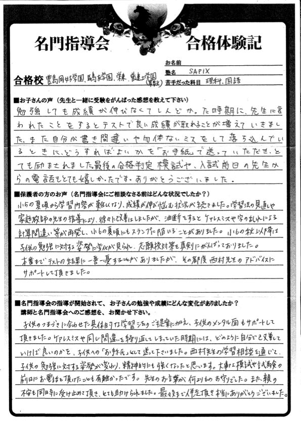 子供のつまづきに合わせた具体的な学習法のご提案に加え、子供のメンタル面もサポートして頂きました。ケアレスミスや同じ間違いを繰り返してしまっていた時期には、どのように自分で改善して行けば良いのかを、子供への「お手紙」として送って下さいました。西村先生の学習相談を通じて、子供の勉強に対数姿勢が変わり、精神的にも強くなったと思います。大事な模試や試験の前日にお電話を頂けたことも有難かったです。先生のお言葉が何よりものお守りでした。また、親の不安も同時に受け止めて頂き、とても助けられました。最後まで伴走頂き本当にありがとうございました。