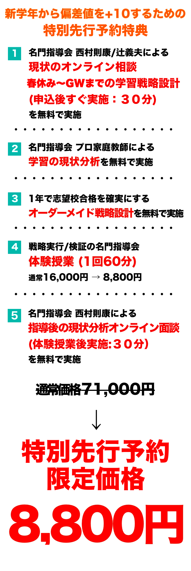 更に現在、先着限定で、「新学年から偏差値を+10するための特別先行予約特典」をプレゼントしておりますので、ぜひこの機会をご活用いただけると嬉しく思います。